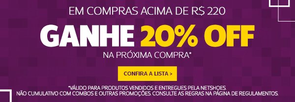 Promoções As promoções na Netshoes não são cumulativas. Sempre que você optar pela promoção disponível neste e-mail, outras promoções ativas no site ou em outros canais serão automaticamente invalidadas, e vice-versa. As promoções são válidas somente para produtos vendidos e entregues pela Netshoes.
