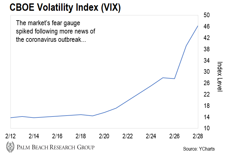 | By Jason Bodner, editor, Palm Beach Insider Coronavirus fears are gripping the globe. There are over 85,000 confirmed cases and at least 2,900 deaths. And with the outbreak spreading in Italy and the rest of Europe, investors are panicking. It’s showing up in the CBOE Volatility Index (VIX) – the market’s so-called “fear gauge.” Over the past week and a half, the VIX has spiked from 14 to over 46 – a major move for the index…  | Recommended Link | | Urgent: Before you cast your vote in November Whoever you vote for this year is entirely up to you. But there’s an extremely urgent investment opportunity in the tech market… And it’s going to happen as a result of the 2020 election. That’s why, no matter who your favorite presidential candidate is… You owe it to yourself and your family to find out about this huge profit potential. | | | -- | This increased fear has sent the markets lower, too. In fact, on Monday and Tuesday, the market had its worst two-day sell-off since 2015. It also means investors are flooding to safe havens amid the volatility. Gold prices surged to seven-year highs, at nearly $1,700. And as I wrote on Monday, the big money is flooding into the more stable, higher-yielding real estate sector. But despite the negative news, I’m still bullish. In fact, we saw an even bigger drawdown in December 2018, when the market crashed nearly 20%… only to rally 27% since then. So this market pressure is normal and healthy after the climb higher since the start of the year. And today, I’ll show you how this short-term sell-off is setting us up to profit while others get shaken out… | Recommended Link | | Buffett goes “all in” on one tech? A Wall Street legend has just made a rather large discovery… For the past several months, he’s been tracking Warren Buffett’s top 25 holdings… And what he found was surprising, to say the least: 21 of Buffett’s favorite companies are going “all in” on a hot new technology… To the tune of $1.7 billion! This is remarkable because Buffett is notoriously “anti technology.” (In fact, he once joked about shooting down the Wright brothers’ first plane at Kitty Hawk!) So, what is this new technology? And why are America’s biggest companies all in a race to implement it? To get the full story, watch this stunning new presentation… What is Buffett’s Big Bet? | | | -- | Following the Market’s Waves Now, I created an “unbeatable” stock-picking system to track the big money’s buying movements. You see, only 4% of stocks have accounted for nearly all the profits of the market each year for the past 100 years. And my system spots these outliers in order to follow the big money to profits. These are companies like Facebook, Amazon, Netflix, and Google. Their stocks can return 10x, 100x, or even 1,000x your money. Using my experience from nearly two decades at prestigious Wall Street firms – regularly trading more than $1 billion worth of stock for major clients – I made sure my system is highly accurate, comprehensive, and effective. But here’s the thing: My system doesn’t just look at individual stocks. It can track big-money buying and selling in the broad market, too. Over time, this buying and selling happens in waves. Just take a look at the chart below…  And right now, my system is saying that we’re in Phase 3… where selling continues to grow. But as a result, this pullback is handing us a buying opportunity… | Recommended Link | | Sell Stocks Now: The Ultra-Rich Are Getting Out Fast With President Trump impeached… The U.S.-China trade war rattling the markets… And the U.S. government $22 trillion in debt… Do you believe we can continue this "Endless Bull Market"? If you want to know what's really going on, there's only one thing to do… Look at what the ultra-wealthy are doing with their money… And they're getting out fast. To protect your wealth – and grow richer in the future, watch this urgent video now. | | | -- | Picking Up Outliers on Sale Back in January, I told readers to book some gains and have dry powder ready for the inevitable sell-off. If you took my advice, congratulations. Now that it’s here, you’ve avoided the 15% drop in the markets. And as you can see below, my system’s index of big-money buying and selling is indicating that selling is taking over…  When the ratio is at 80% (see the red line above) or more, it means buyers are in control and markets are overbought. And when it dips to 25% (the green line) or lower, sellers have taken the reins, leading the markets into oversold territory. Although we’re not near oversold levels yet, the index is trending lower – which means lower prices are ahead. So for now, expect more market zigzags. But let’s embrace this pullback and continue to be patient. When the buying cycle hits Phase 4 (see second chart above), we’ll pounce. If you’re looking for safe, high yields in this volatile environment, consider putting some money into the real estate sector through the iShares U.S. Real Estate ETF (IYR). This exchange-traded fund holds a basket of 113 top real estate plays. Just remember, this phase will pass. And we’ll be able to buy high-quality outlier stocks at discounts soon. Stay bullish!  Jason Bodner Editor, Palm Beach Insider P.S. My stock-picking system recently pinpointed SolarEdge Technologies (SEDG) as an outlier for my Palm Beach Trader subscribers. And just a few weeks ago, we took 111% gains off the table as dry powder to buy our next triple-digit winners. As I mentioned, this market pullback is handing us a chance to buy these great companies at a discount. And my system can help you spot them, too – just like it did with SEDG. To find out how it spots big-money investors piling into the best stocks – and how you can ride them to profits just like my subscribers – check it out right here. Like what you’re reading? Send us your thoughts by clicking here. IN CAS